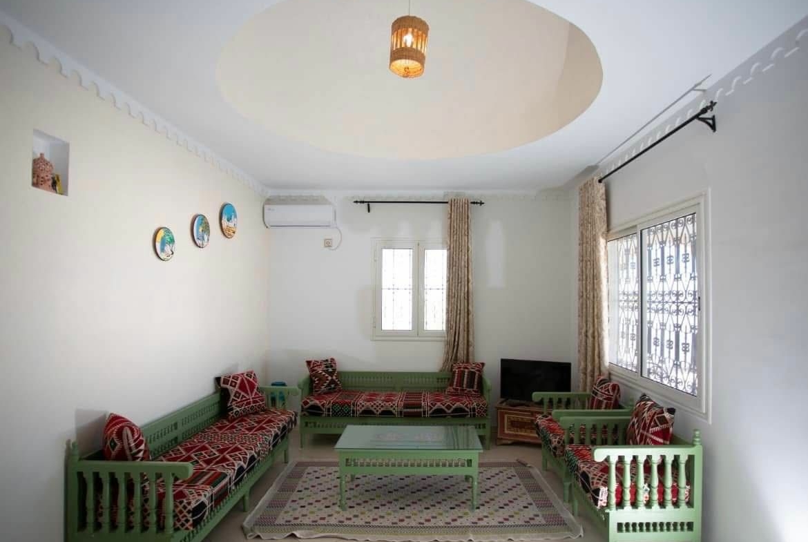 La villa dispose d’un extérieur agréable et soigneusement aménagé, idéal pour la détente. Destinée à la location annuelle, elle offre un cadre de vie calme, chaleureux et typiquement djerbien, parfait pour une résidence principale à long terme.