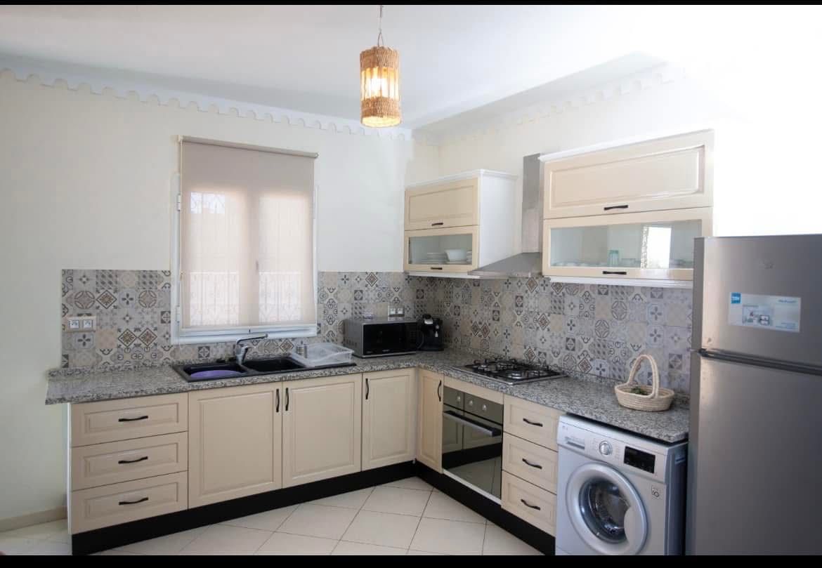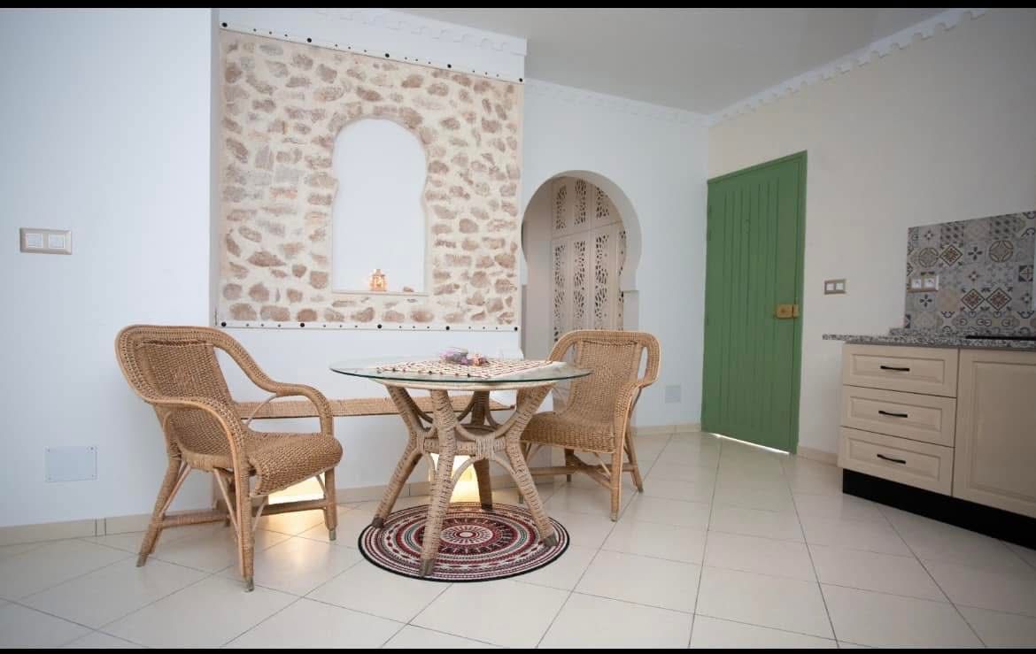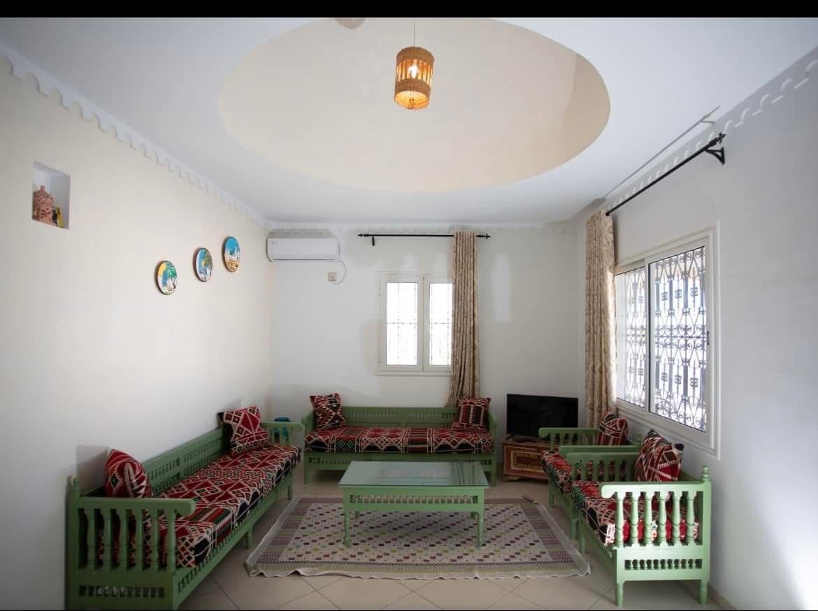 Belle villa de style djerbien authentique avec piscine privée, située à Erriadh, dans le quartier prisé de Djerba Hood. Elle se compose de deux suites bien équipées, d’une cuisine entièrement équipée et d’un salon confortable et fonctionnel.